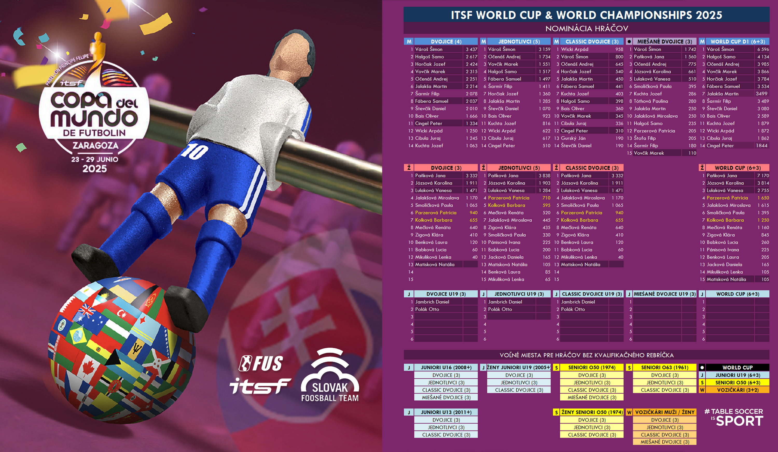 Na tomto podujatí nemôže chýbať ani Slovenská foosballová reprezentácia. Našim cieľom je nadviazať na úspechy z predchádzajúcich ročníkov. Aj preto výber hráčov podlieha náročnej kvalifikácii, počas ktorej hráči zbierajú body a výsledky počas posledných troch sezón na domácich ale aj svetových turnajoch ITSF. Tu sa dozviete mená hráčov z najužšieho výberu, ktorí nás budú reprezentovať v kategórii mužov, žien a juniorov.